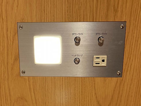 枕元の照明操作パネルと電源コンセント。