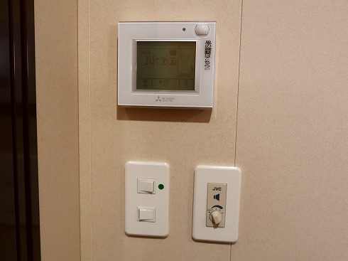 エアコン操作パネルと照明スイッチ、館内放送の音量調整つまみ。