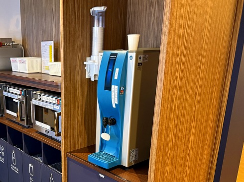 電子レンジの隣には給水器と紙コップが置いてあり、自由に飲むことができます。