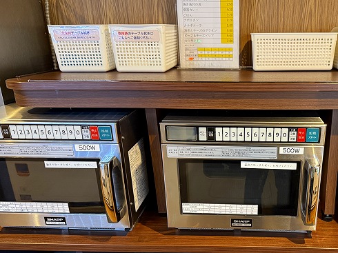 電子レンジが3台が並び、冷凍食品自販機で売っている商品は、上に掲示された商品ごとの番号を選択して「スタートボタン」を押すと適度な状態まで温めてくれます。電子レンジは、持ち込んだ食料品を温めるのに利用することもできます。