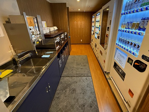 船内の冷凍食品自販機コーナー。左側に給湯器と電子レンジ、給水器があります。