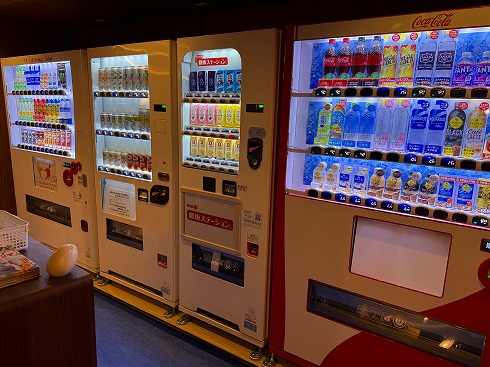 案内所向かい側にある、清涼飲料水の自販機コーナー。陸上の自販機と価格は変わらないので、大容量のペットボトル飲料でなくてもよければ、持ち込まなくても大丈夫です。