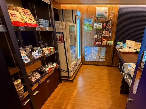船内中央にある売店。アルコール飲料や清涼飲料水、お土産やスナック菓子、インスタント食品、ハンドタオル等が売られています。案内所の乗組員の方が、売店の売り子も兼務していて、乗船後しばらくは忙しそうにされています。